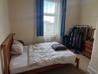 The room on offer is spacious and bright, furnished with a king-sized bed, dresser, clothes rail and a small TV. there is also a small cupboard for storage. The flat has a large, well-equipped kitchen/dining area and a bathroom with shower over bath. There is also a private roof terrace for tenants which is an amazing wee haven in the warmer months.