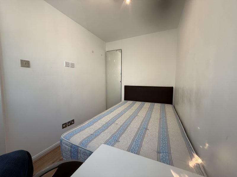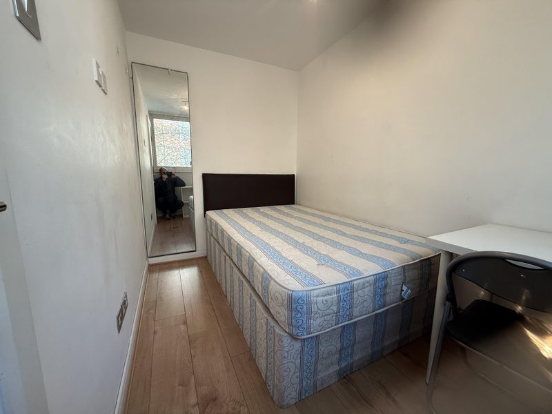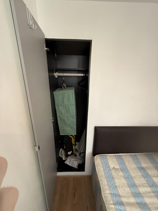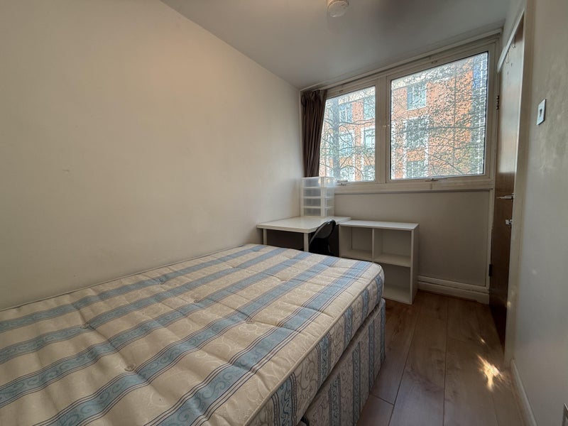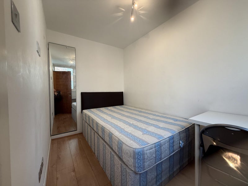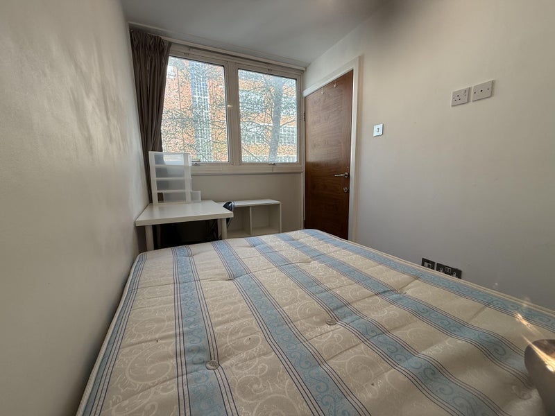 This is a bright double bedroom overlooking a quiet, charming street with trees. The double bed has a superb high quality orthopaedic mattress. There is a built in wall wardrobe with hanging rail, shelves and full length mirror, desk and chair and large wall mounted TV