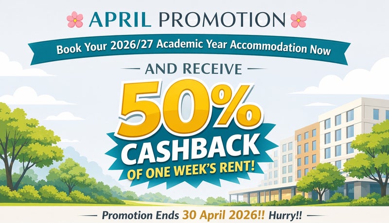 APRIL PROMOTION! Secure your booking for next academic year 2026/27 and enjoy 50% cashback of one week’s rent ! Offer ends 30 April 2026
