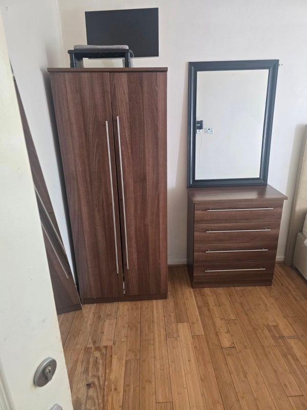 Fully furnished double room with a comfortable bed, spacious wardrobe & chest of drawers