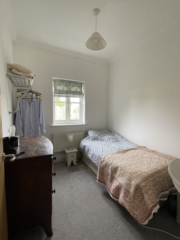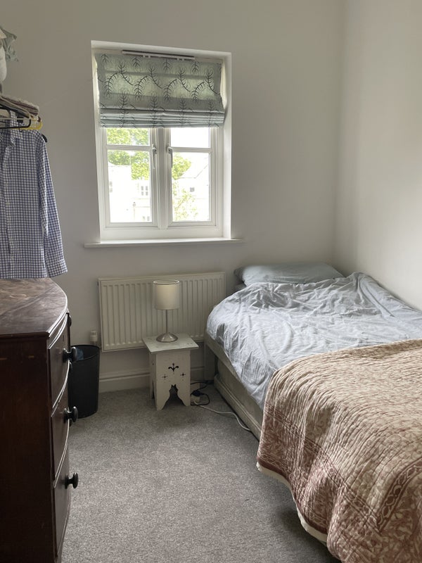 The room is a light single room (7ft9 x 8ft8) on the second floor, that gets lovely afternoon sun. It would suit someone who wants a quiet home from home. There's a chest of drawers, hanging space, new carpeting, double glazed window. I can supply bedding and towels.