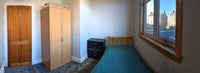 The bedroom is fully furnished (single bed, wardrobe, chest of drawers, desk). Its windows are facing the gardens (no traffic) and let in a lot of sunshine when the weather allows it. It's also got a lockable door.