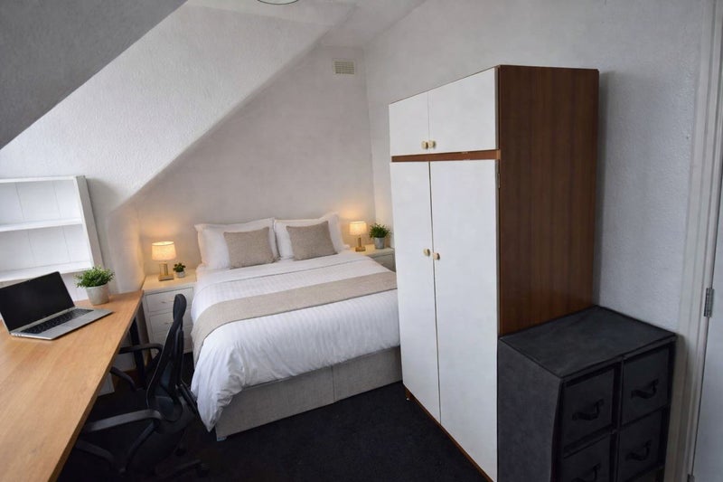 Each bedroom is fully furnished with a double bed, wardrobe, drawers, desk, and chair, providing a comfortable and practical space for both studying and relaxing.