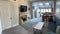 Large lounge/dining area with sofa, fireplace, wall mounted 32"Tv and a dining table.