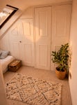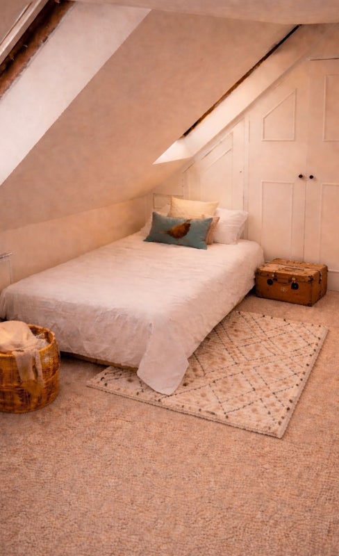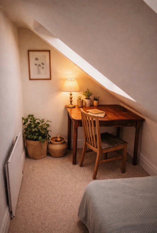 A bright, peaceful top-floor room with a private, tucked-away feel. The space is comfortable and well arranged, with a bed, desk and built-in storage, making it a practical base for both relaxing and working from home.