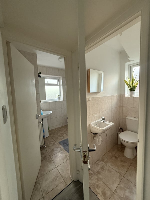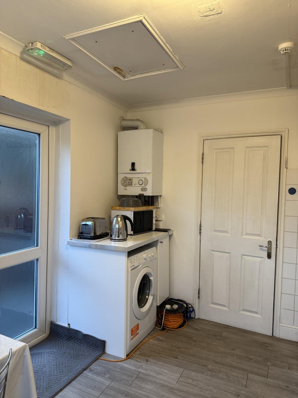 First floor, east faced room in HMO property. Plenty of space for adding own things. Triple wardrobe and two chest of drawers, side table with lamp. Large kitchen, fully equipped, micro, fridges, cooker, washing machine, etc.