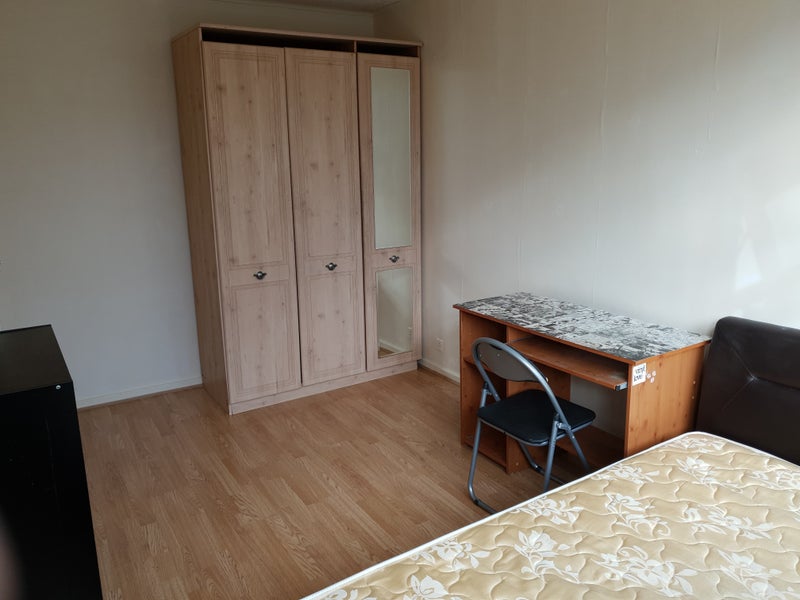 The room is located on mid terrace house first floor. The room has a king-sizebed, chest of drawers, wardrobe, desk + chair.