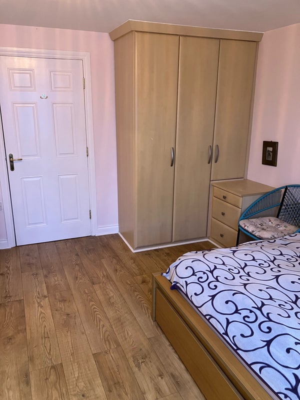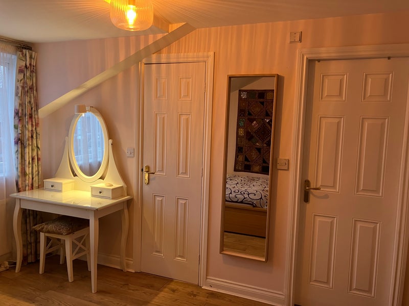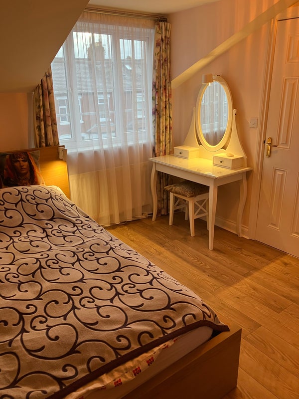 A spacious sunny bedroom with a king bed, en-suite shower and toilet, cloakroom, fitted wardrobe, own fridge in the shared kitchen with a de Longhi coffee machine, use of the lounge, shared bathroom with a bath, full fibre fast internet, a short walk to John Leigh Park and tram station. A Jewish household.