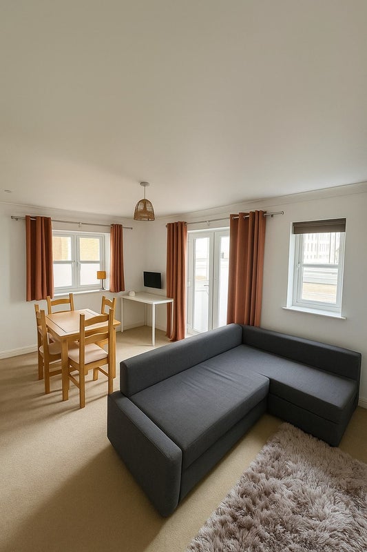 Spacious and bright 1-bedroom flat located in Riverview House, Viersen Platz (PE1 1FX), right in the heart of Peterborough city centre and overlooking the river. It's recently been deep cleaned, re-painted and re-furnished to make it a home. The apartment will be part-furnished (you can choose what you want to keep there and use) and features an open-plan living and dining area with floor-to-ceiling windows, a modern kitchen with integrated appliances, a large double bedroom with plenty of storage, and a stylish bathroom with shower and bath.