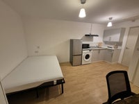Enjoy a fitted kitchenette with fridge and washing machine for added convenience.