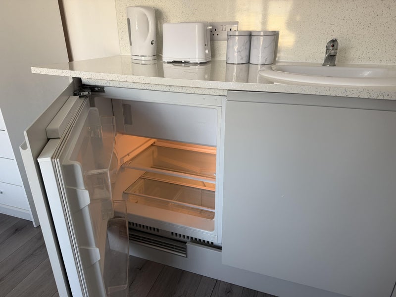 The coffee station includes your own integrated fridge freezer, wash basin, kettle, toaster and storage cupboards.
