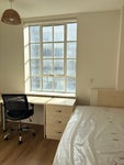 The room comes with a private bathroom and is fully furnished, including bed, mattress, desk, and storage. You will share the kitchen with 2 other flatmates. The kitchen is fully equipped with an oven, microwave, cookware, and utensils.