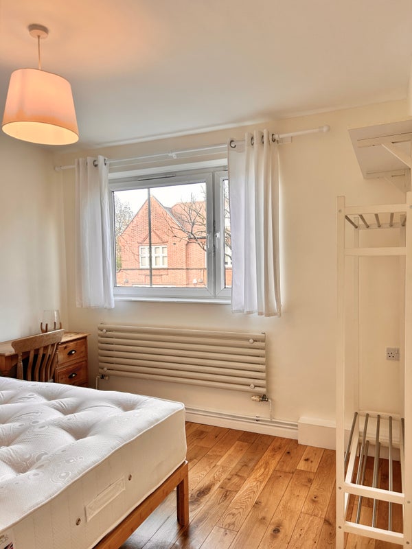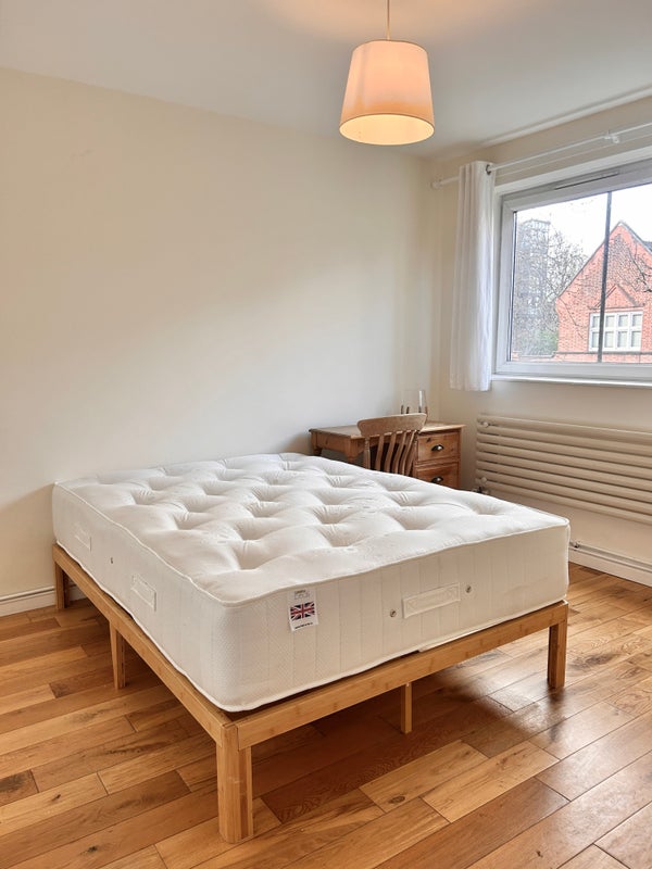 🛏️ The Room - Bright, airy double bedroom with built‑in storage, pinewood desk and chair, fresh neutral décor, and wooden floors that catch all the morning sun. Shared modern bathroom – spotless, with shower + bath.