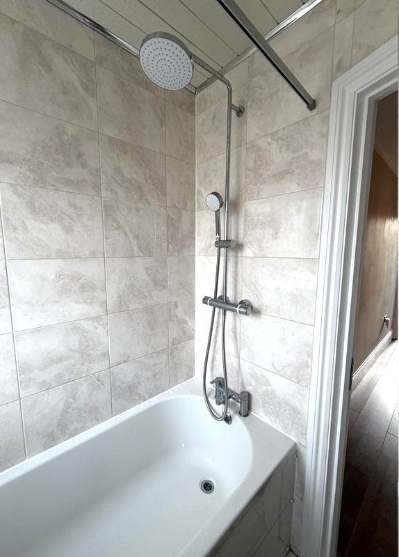 Tiled separate toilet and bathroom, fully fitted kitchen.