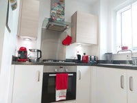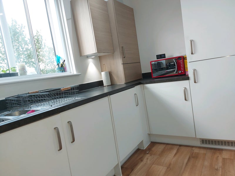 Comfy, warm and spacious master bedroom with king size bed and en-suite shower and toilet. Part of a clean, furnished and modern 2 bed new build apartment.