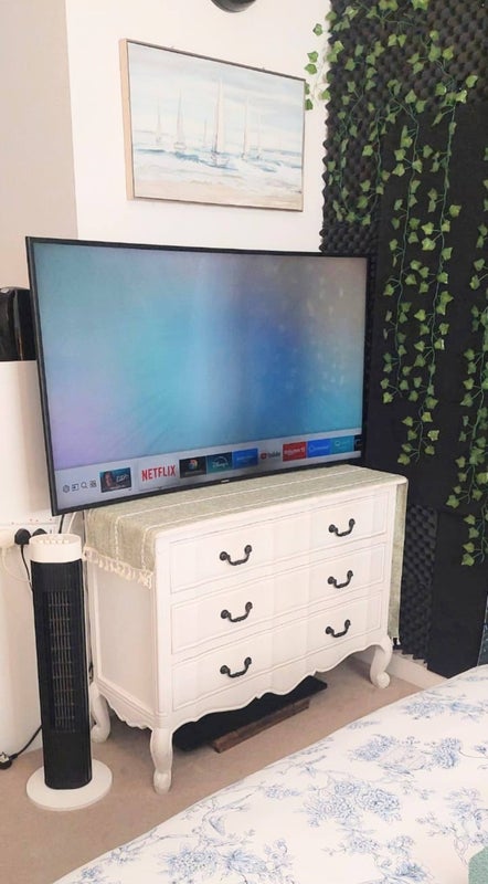 There is a chest of drawers and a smart TV in the room and extra storage under the bed.