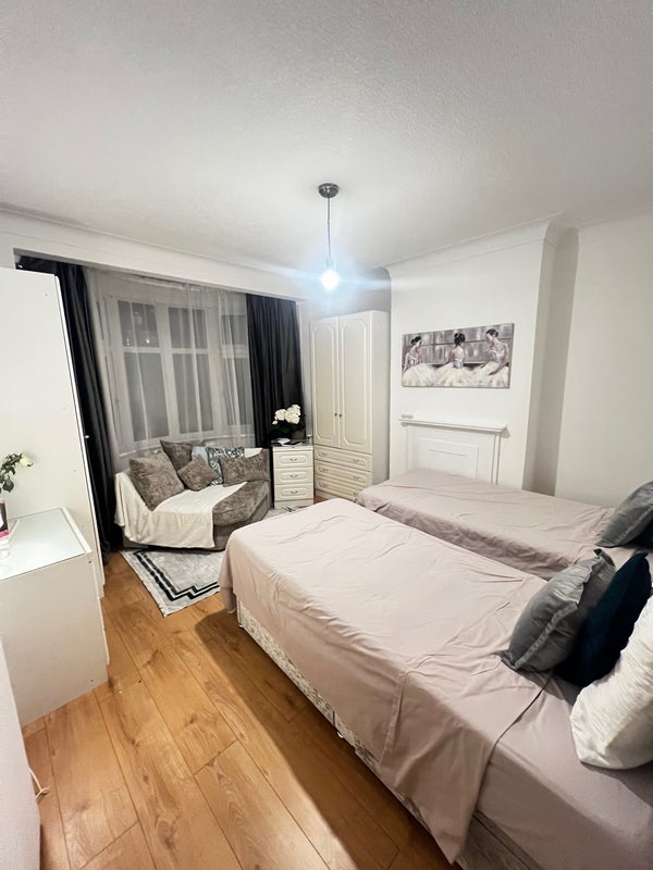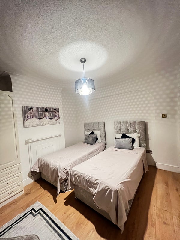 A warm and welcoming twin room available in a clean, peaceful home. The space is thoughtfully set up to feel relaxing and homely, with soft tones, comfortable beds, and a calm atmosphere—perfect for unwinding after a long day.
