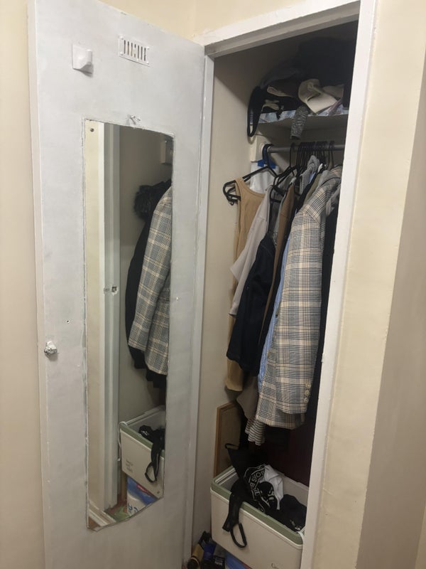 Room comes furnished with a desk, chair, small built in cupboard, bed, mattress, shelves, corkboard
