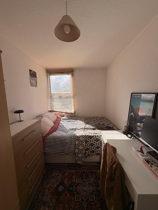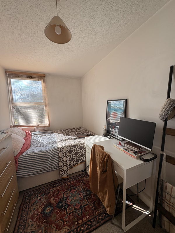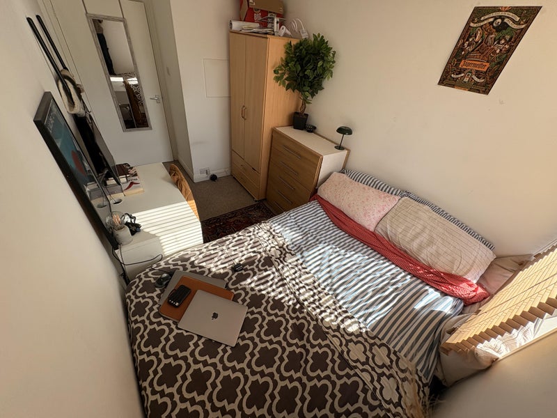 Your room is on the top (third) floor of the building, on its own private side of the flat. You’ll have your own bathroom (loo, sink, shower) and a furnished double bedroom (desk, double bed, chest of drawers, wardrobe), plus an extra rack and hangers in the corridor if you need a bit more space.