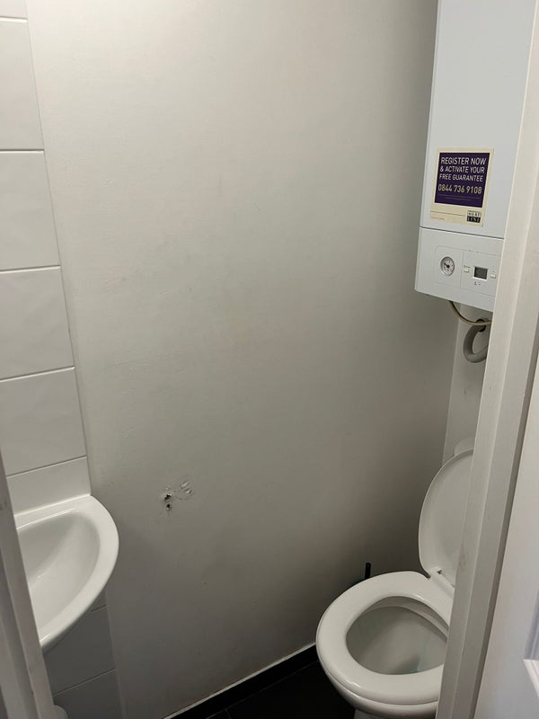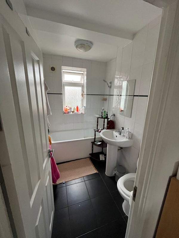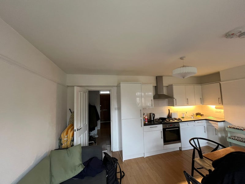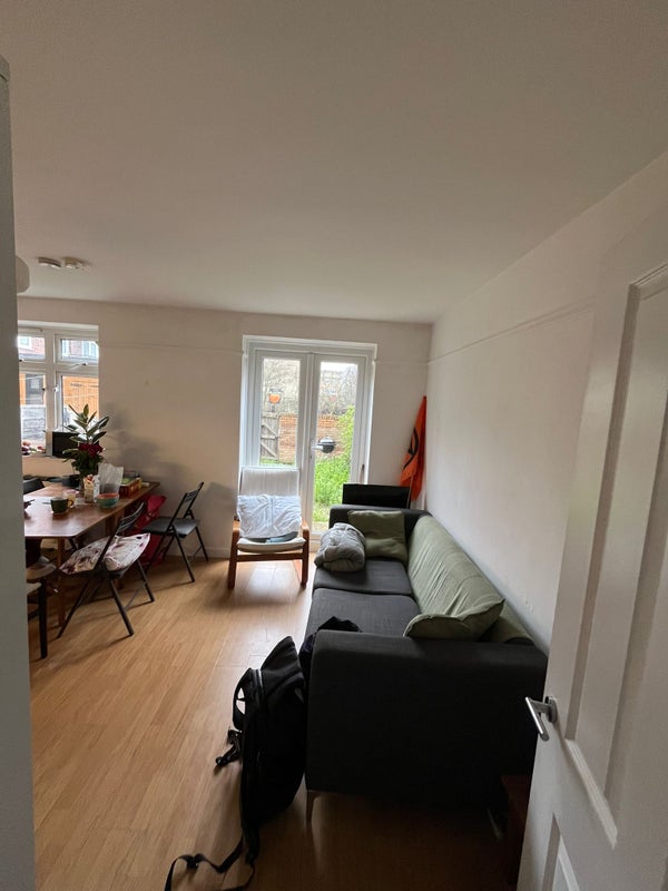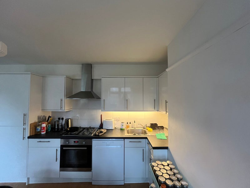 10qm room in flat share with three flatmates. It's a maisonette with a shared kitchen and two loos, one shower. In my room there are a bed, mattress, cupboard, sideboard, desk and two lamps.