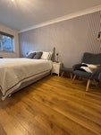 Large room, fully furnished with bed, wardrobes, storage, chair.