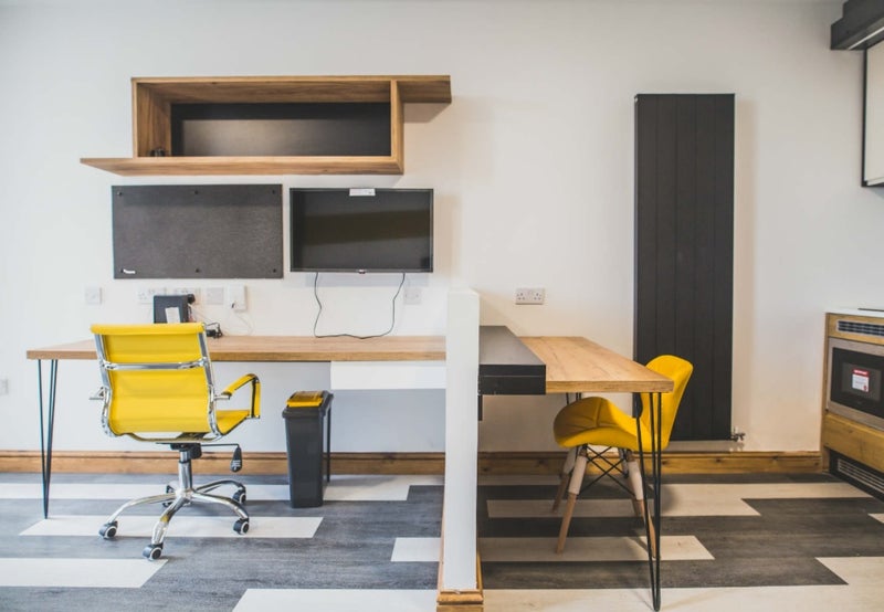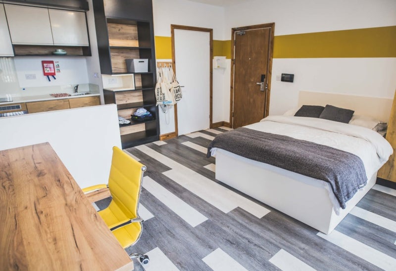 The studio features a modern design with a comfortable double bed (with storage), spacious study area, Smart TV, large wardrobe, and a fully equipped kitchenette including a hob, fridge with freezer drawer, and microwave. The stylish bathroom includes an electric shower and contemporary fittings.