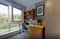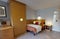 In this second-floor studio for students will get furnishing pieces such as a double bed, a wardrobe, a window for ventilation, a smart TV to watch, a designated study area with a study desk and a chair, and a private bathroom with a mirror, washbasin, toilet, toilet roll holder, a towel rail and a shower. This studio also features a private equipped kitchen with appliances like a cooking hob, oven, microwave, sink and a refrigerator along with a dining table and chair.