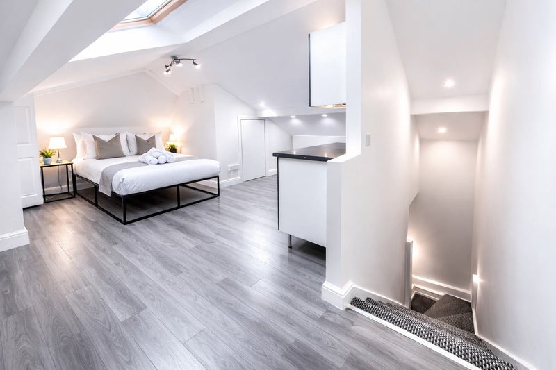 The room is bright, spacious, and finished to a high standard. It includes a small double bed with a quality mattress, ample storage, space for a desk, and a private ensuite shower room. The top-floor loft position provides extra privacy and a quiet living environment. The room also benefits from its own kitchenette, ideal for preparing quick meals, including air-frying.