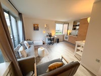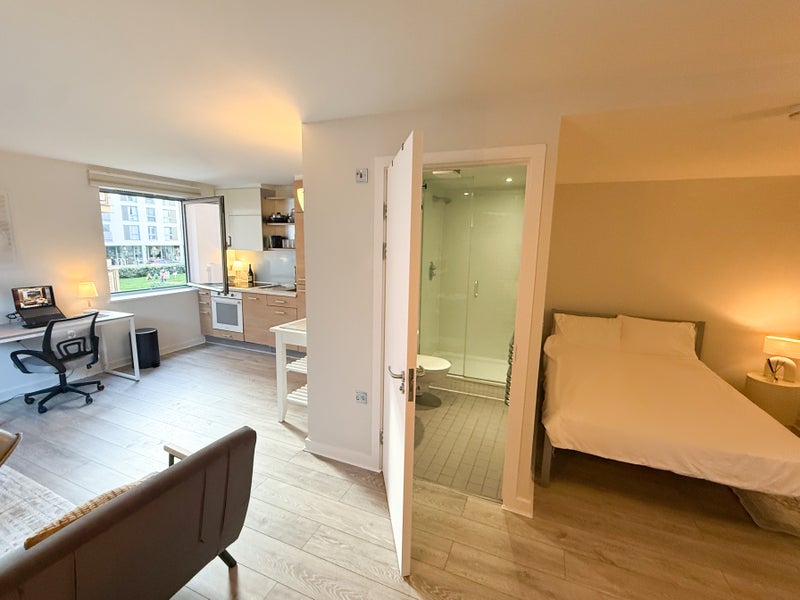 The studio is spacious, with a separate space for the bed, in a modern development with a 24/7 concierge, pool, and a large gym.