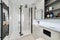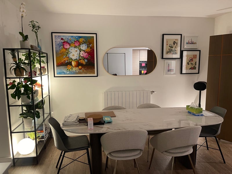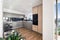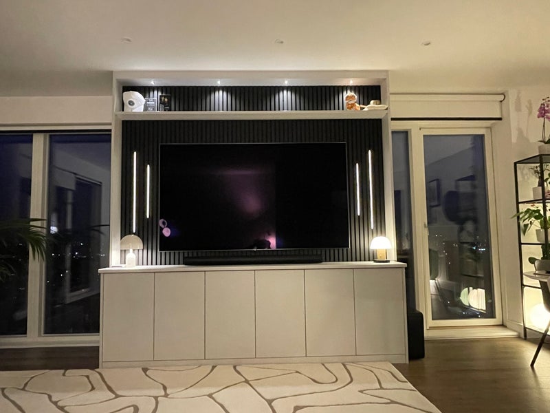 Beautiful high specs kitchen, designer feel, living room, 77 inch TV, sofa, dining area.