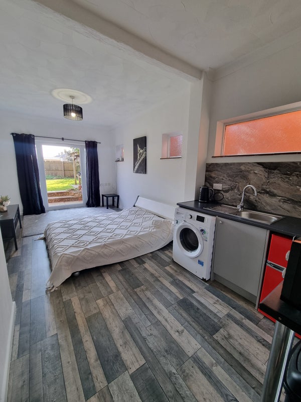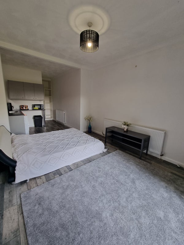 Fully furnished, all wihe goods and kitchen facilities are included with king size bed. Plenty of off road parking is avaliable, walking distance to all supermarkets and University ,Bus stop is nearby many different bus routes .Lovely garden shared with upper flat .