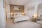 The modern bathroom is stunning with moroccan style tiles, large bath and rain shower.