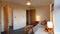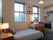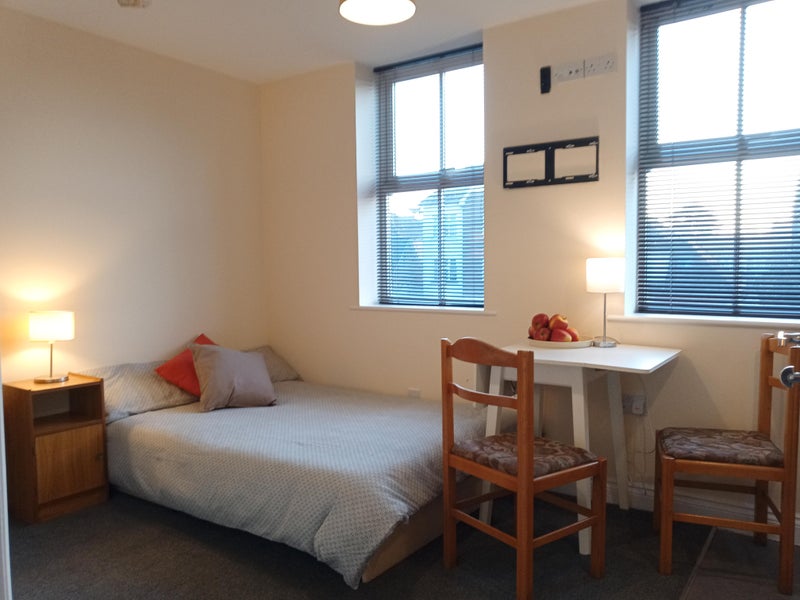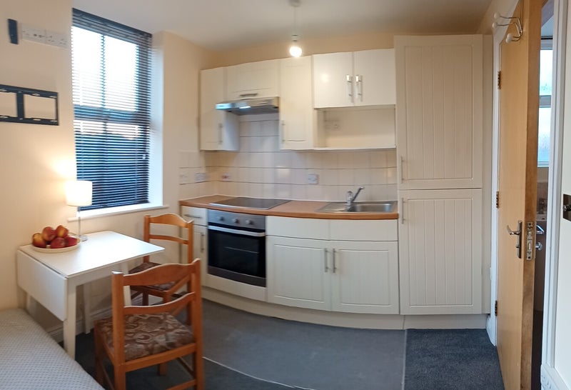 The studio can fit a double bed (& wardrobe) on one side with its own kitchenette on the other - including storage cabinets, 4 point electric hob/stove, full oven, sink & full-height, integrated fridge-freezer.