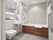 The bathroom is shared between the two rooms and includes a bathtub and shower.