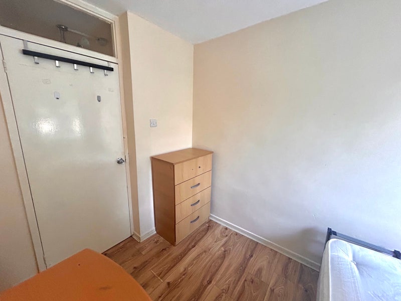 The property itself features four bedrooms, two bathrooms, a communal kitchen, and garden access. The available bedroom features a small double bed, a desk, and a chest of drawers. There are also additional cupboards on the landing which can be used as wardrobe space.