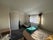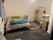 The room is fully furnished with a double bed, clothes-rail, desk with chair, and area with sofa and