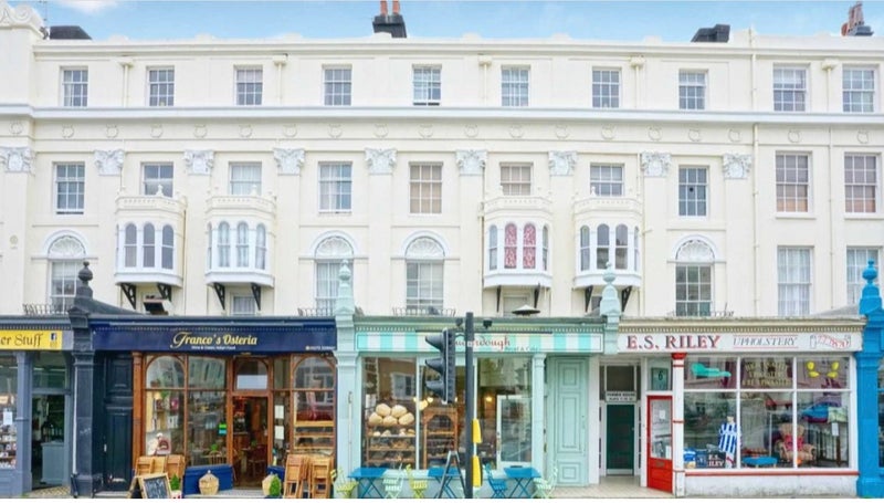The flat is right next to, rather than on, the beach. You can see the sea from the flat but 'sea views' might be pushing it a bit. There is a bakery/coffee shop downstairs and lots of pubs and eateries