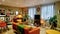 Share of open plan lounge/kitchen/diner and bathroom with overhead shower and bath.