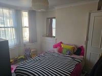 A nicely sized double bedroom on the 1st floor of a three storey house (Basement, Ground, First). The room has a cupboard and wardrobe built in, but otherwise comes unfurnished.