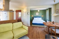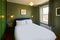 Inside, the property features an open-plan living, dining, and kitchen area designed for socialising and relaxation. The property features one beautifully styled double bedroom, offering a calm and cosy retreat. Finished in deep green tones with contemporary wall lights and minimalist floating bedside tables, the space balances character with comfort. Plenty of natural light and a peaceful view of the quiet street below.