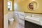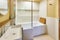 The modern bathroom is styled with classic white tiles and modern fixtures and features a full-sized bathtub with overhead shower, large basin and WC.