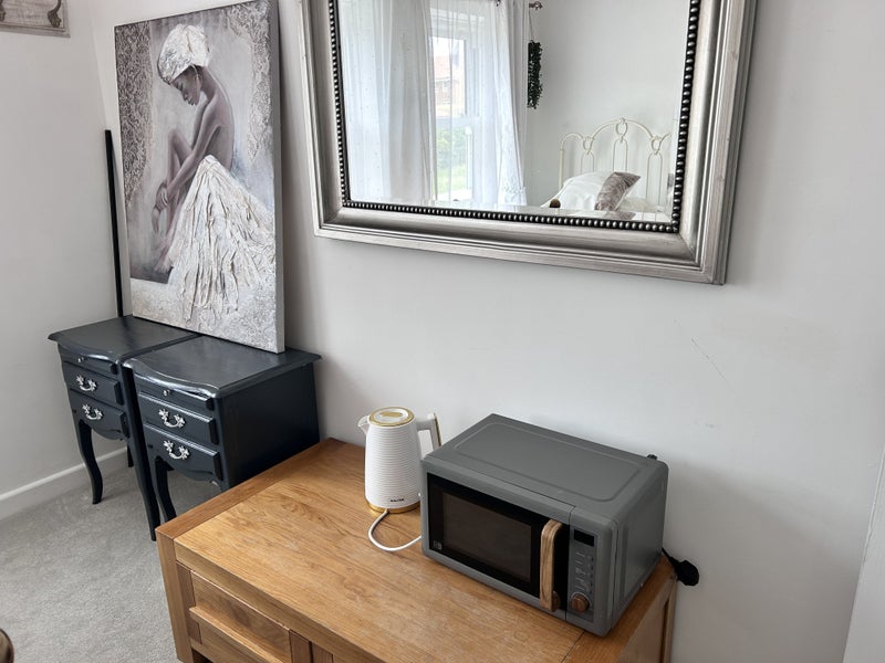 Double Sized Room. Self contained. Female only. I have two puppies that do bark !! I have my own shower en suite but may use the bath-occasionally. The Room has microwave, air fryer, kettle mini fridge cutlery and essentials.