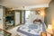 The house has a fridge each, power shower and bath, new boiler, big washing machine, double glazing, 2 loos, fire alarms and is warm in winter and cool in summer!