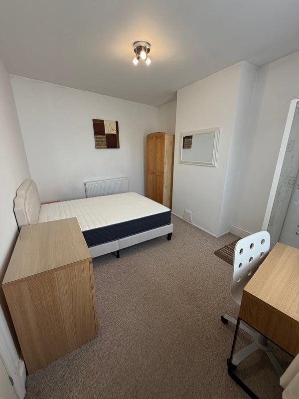 Large Double bedroom with private en suite shower cubicle…brand double bed and mattress, double wardrobe, large chest of drawers and desk/chair. Communal lounge, kitchen, bathroom and 2 toilets.