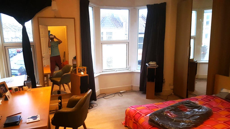 The room: It’s a very large double room — the master bedroom — located upstairs on the first floor overlooking our reasonably quiet road (Raleigh Road). The sun shines directly through the big bay windows all morning, so it's very sunny and bright — you can even sunbathe in your own room when it's sunny! You also get a view of the Dundry Hills in the distance, as well as the surrounding streets.