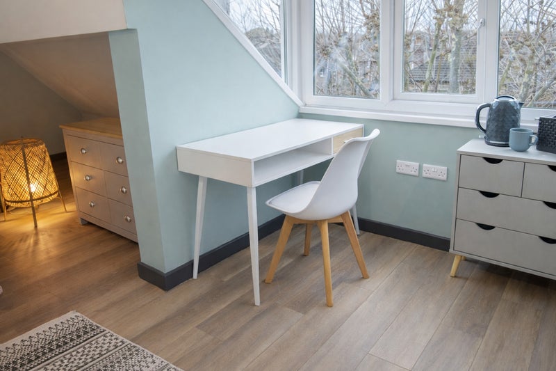 • Fully furnished bedroom with a good quality bed, bedside table, wardrobe, chest of drawers, desk and chair