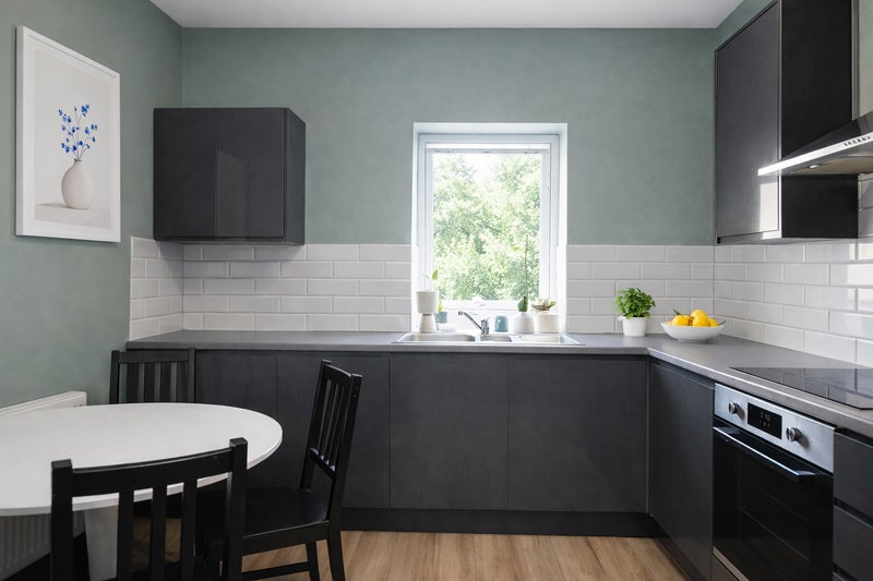 The spacious double room is fully furnished and offers plenty of storage and includes a double bed, bedside table, desk, chair, chest of drawers and occasional chair. There is a small kitchenette area with an undercounter fridge including an ice making compartment. A toaster and kettle are also provided. The communal kitchen/dining/living space includes a sofa, tv, dining table and chairs, as well as a fully equipped kitchen with a microwave, freezer, crockery, cutlery and cooking pots and pans, including a dedicated storage space for groceries.