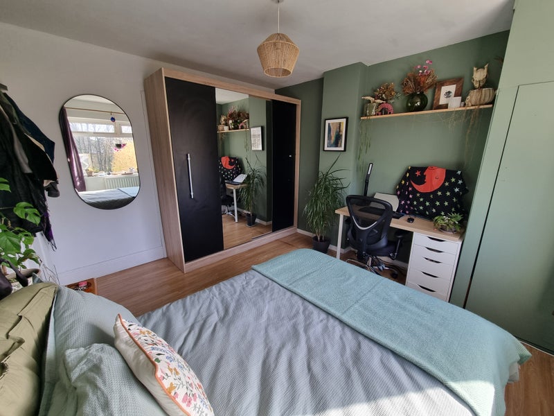 The room has loads of storage, a desk, office chair, and large window. There is a bathroom on the same floor shared with 1 other housemate (f25).