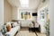 Open plan kitchen lounge with 2 ovens, 5 ring hob, American fridge freezer, dishwasher