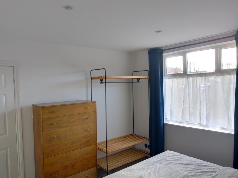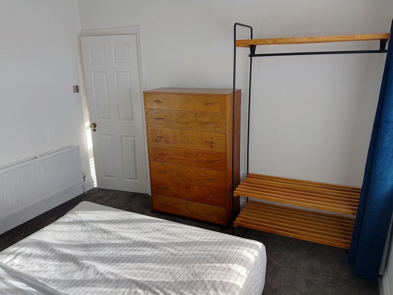 Large Bright Double room available. The room is furnished and I'm also open for it to be changed. There is a shared living room and separate shared kitchen. It's a nice fresh clean house with a small garden to enjoy a morning coffee in the sunshine. The room gets lovely light in the evenings. There are black out blinds also! There is a desk and drawers, (and wardrobe to be added soon).